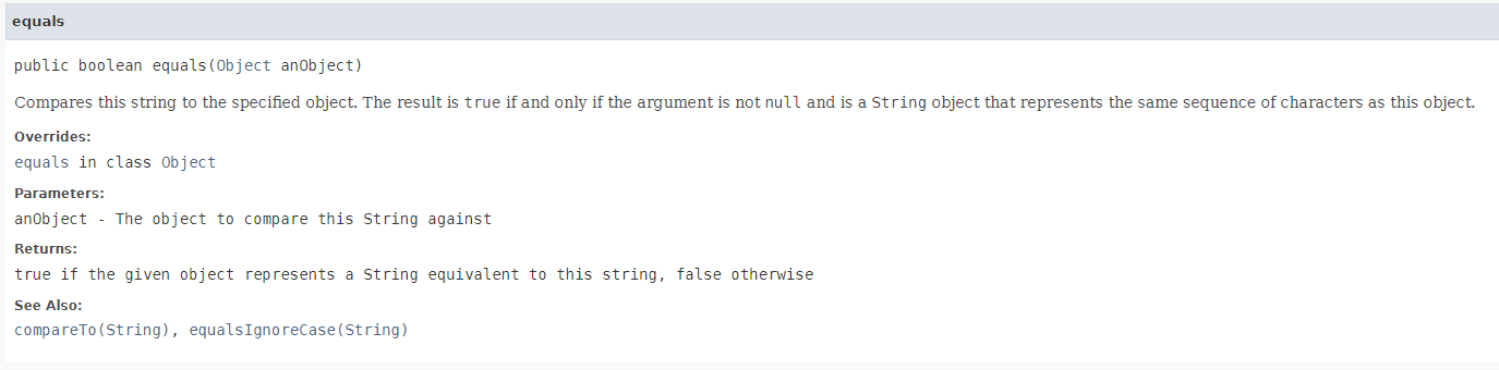 [https://docs.oracle.com/javase/8/docs/api/java/lang/String.html#equals-java.lang.Object-]
