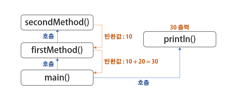 //secondMethod()가 return한 결과에 20을 더하여, 자신을 호출한 main 메서드에게 그 값을 반환합니다.