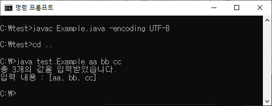→ test 폴더에 들어있는 Example.class를 실행합니다. main함수에 aa, bb, cc를 String 배열 형태로 전달합니다.